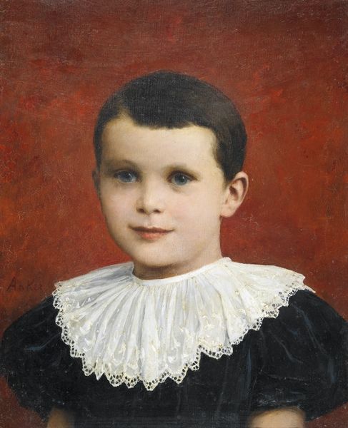 Curator: What a darling little fellow! There's a sweetness to his gaze, a tender vulnerability in the flush of his cheeks. It’s charming. Editor: We're looking at a painting called "Portræt af Holger Aagaard Hammerich som 4-årig" created in 1849 by Elisabeth Jerichau Baumann. It is currently held at the SMK, the National Gallery of Denmark. This piece, crafted with oil on canvas, captures a young Holger, age four, within a traditional portrait setting. Curator: Tradition is certainly the word that springs to mind. Look at how his buttoned tunic neutralizes any overt display of class, while still conforming to ideas about proper childhood. Do you see any social tension? Editor: Indeed. Baumann's positionality is critical here; as a female artist in the 19th century, especially one depicting childhood innocence, is deeply intertwined with societal expectations regarding femininity and domesticity. Child portraiture often served ideological purposes, reinforcing specific notions of family values. Curator: It does raise questions, doesn't it? About representation and power. Whose gaze is privileged here? The artist's, commissioned patron, or society which deems childhood innocence crucial for maintaining a given social structure. And what's this child's later life? Editor: I believe Hammerich became a well known engineer. While beyond the immediate scope of the work, it reminds us of art’s interaction with later social and professional status and power dynamics beyond its creation. The artwork participated in crafting that image, to a degree. Curator: The institutional forces at play are also really important. What did Baumann's association with institutions like the Royal Academy of Fine Arts do for her acceptance and what impact did this system have on female creativity? The Salon system legitimized artists but concurrently circumscribed creative freedom by dictating certain norms and practices. Editor: It highlights how artists of the time negotiated socio-political realities, creating images that sometimes adhered to—and at other times subtly resisted—the prescribed visual norms of the time. This exploration into portraits makes you wonder about those silent conversations woven through colors and gazes! Curator: Absolutely. Context is so important when trying to fully understand works like this and not just for their artistic quality, but what they teach us about culture as a whole.