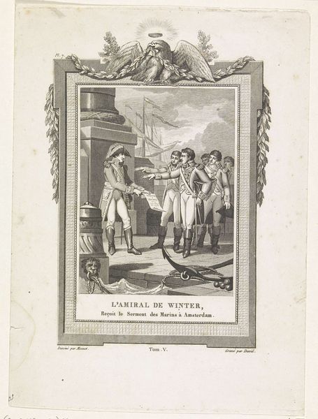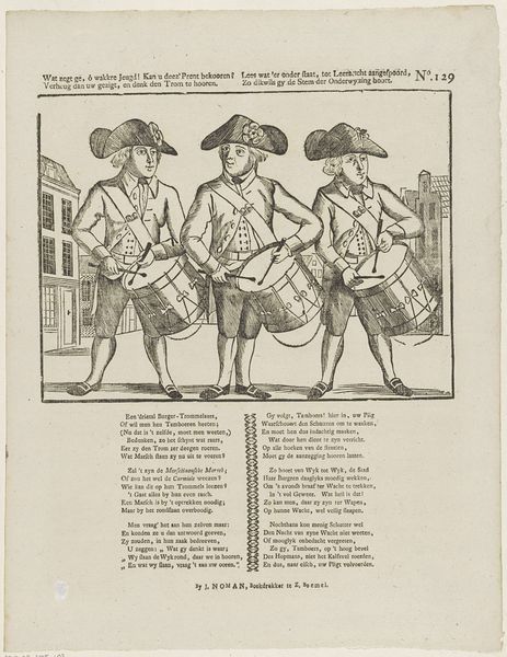 This print, made by Erven de Weduwe Jacobus van Egmont, presents three men adorned with tricorne hats. The tricorne, a symbol of 18th-century fashion and status, immediately anchors us in a world of social hierarchy and sartorial elegance. Notice how the rightmost figure raises his hat in a theatrical gesture. This act of doffing one's hat carries a rich history, evolving from medieval displays of deference to more modern forms of greeting and respect. Think of similar gestures across cultures – the bowing of heads, the curtsying of women – all conveying a sense of acknowledgment. This gesture may be linked to the archetype of the 'wandering soul,' always in motion, seeking connection. We see echoes of this in classical depictions of Hermes, messenger of the gods, forever flitting between worlds. Like Hermes, these figures become carriers of cultural memory, reminding us that human expression is a layered tapestry woven across time. The hat, once a mere object, transforms into a potent symbol, laden with meaning and history.