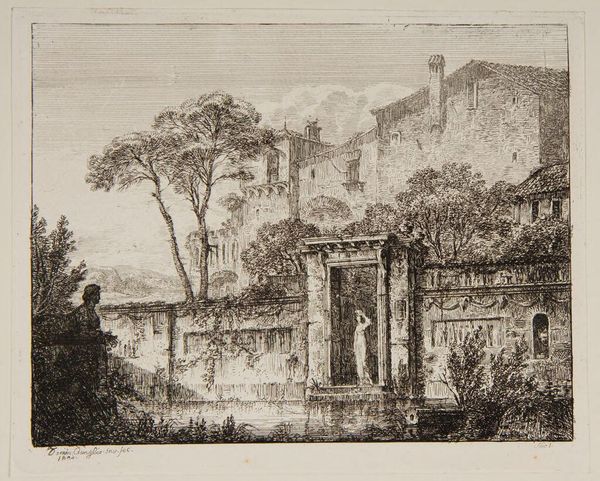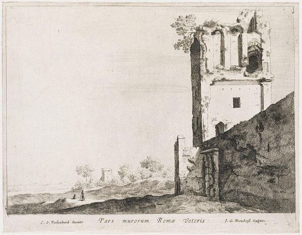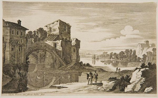 Curator: Look at this etching, likely from the 17th century, attributed to Jean Morin after Cornelis van Poelenburgh. Note the fine lines, the textures created by the burin. Editor: It strikes me as a scene of melancholic grandeur. The crumbling ruins evoke a sense of time's passage, of civilizations lost. Curator: Indeed, consider the availability of paper, the process of etching—a copper plate, acid, and then the press—these were not insignificant undertakings. The print would have circulated, carrying this vision of the Roman campagna to a wider audience. Editor: And what a vision. The ruined buildings aren’t just stones; they’re symbols of a fallen empire, perhaps a memento mori. The seated figure adds to this feeling, a contemplative witness to history. Curator: I agree. The print medium itself speaks to a certain democratizing of art. This image, reproduced many times, becomes available to many viewers, shaping perceptions and understandings of place and history. Editor: It’s a beautiful intersection of skill and symbolic weight, a reminder that even in ruin, there's something powerful to be found. Curator: It's a reminder that art is fundamentally a material process, even as it shapes cultural meaning.