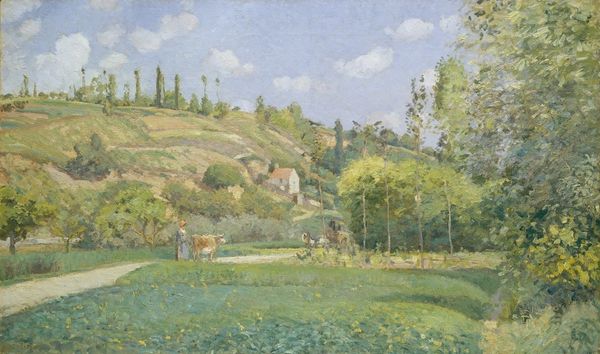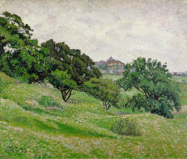 Editor: So, we’re looking at Anton Romako’s "Die Meiereiwiese in der Vorderbrühl mit der Ruine Mödling," created in 1885 using oil paint. I find it has this sort of dreamlike quality, with soft brushstrokes and muted colors. It definitely leans into plein-air techniques. How do you interpret its visual impact? Curator: Well, focusing on formal elements, the painting demonstrates an intriguing tension between structured composition and spontaneous execution. Notice how Romako juxtaposes the horizontal expanse of the meadow with the verticality of the trees and the ruin on the hill. Consider, too, the contrast between the blurred foreground and the more defined structures in the background. Is this imprecision purposeful, perhaps symbolizing the passage of time? Editor: That’s interesting. I hadn’t thought about the tension like that. It seemed almost haphazard at first, but there is definitely intention. Does the contrast lead to a semiotic perspective or a potential breakdown of any structure? Curator: Exactly, the fragmented quality—in essence the ‘ruin’ aspect within its materiality and structure—can evoke a sense of incompleteness, reflecting the inherent limitations of representation itself. Furthermore, we observe Romako’s manipulation of color. Notice how the predominantly muted tones create a unified, almost melancholic mood. How does the interplay between these tonal shifts—dark versus light, muted versus bold—guide your reading of this work? Editor: I see now that even with the lighter greens in the center, it gives that central expanse an illusory feel as part of the atmospheric conditions that define this period and place. Thank you. I feel like I'm grasping more of this picture now! Curator: And I think framing this work in terms of opposing design elements helps bring its complexities to light.