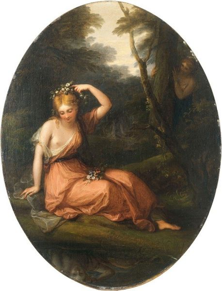 Editor: So, here we have George Baxter's "The Parting Look (with Man and Box)," created in 1858. It seems to be some kind of print on paper depicting a woman saying goodbye, maybe at the edge of town. The woman’s garments feel…almost theatrical. What do you see when you look at it? Curator: Well, beyond the Romanticist style's inherent theatricality, consider the social context. This work isn't simply a sentimental scene, but it engages with a broader narrative of movement and social mobility. Look at the "man with a box" aspect, likely luggage. What does this detail suggest about journeys of the time? Is she staying, and he is going away to seek work, possibly overseas, which had enormous socio-political repercussions across England and Europe? Editor: That's a very different reading than the romantic parting I was imagining. You’re saying the work isn't just about love but reflects anxieties around emigration, perhaps? Curator: Precisely. Baxter’s strategic distribution of prints like this put such societal pressures right into people's homes. Note how the idyllic setting clashes with the implicit melancholy, amplifying the emotional weight of potentially permanent separation. Think about the market for these prints – who was buying them, and what role did they play in shaping public opinion around travel and opportunity? Editor: That really makes me rethink the staging and the woman's expression. It’s not just a generic "goodbye;" it’s charged with socio-economic meaning. Curator: Exactly! The print becomes a microcosm of larger societal forces at play. Now, knowing this, how might you interpret the title differently? Editor: I guess “The Parting Look” isn't just about missing someone; it’s about England potentially missing a whole generation. Thank you, I have to say I find this view very revealing! Curator: Indeed, viewing art as a reflection of cultural and institutional landscapes greatly enriches our understanding. It’s been insightful!
