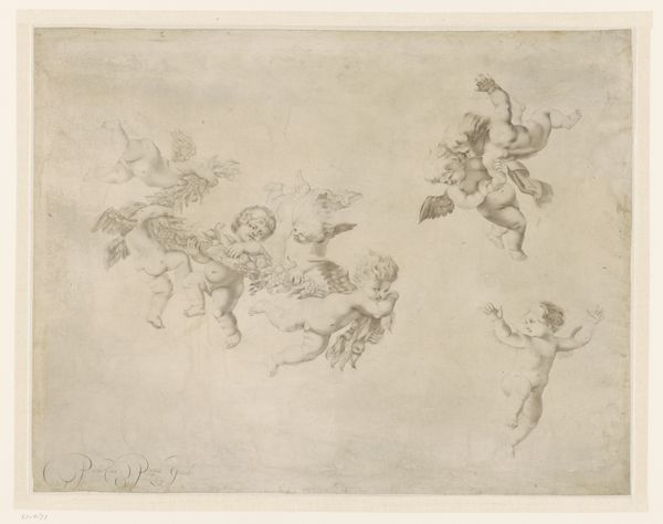 Gaspare Diziani’s drawing “Two hovering putti” captures the essence of 18th-century Venetian artistry. Diziani, who navigated the world of Venetian painting during a time of cultural opulence and social stratification, infuses the sketch with a sense of buoyant freedom. The putti, often interpreted as symbols of divine love, grace, and innocence, were a visual trope deeply embedded in the religious and decorative arts of the time. The free flowing sketch of the putti suggests a desire to break from the rigidity of the art that came before it. There is freedom and movement in this piece that gives it an energy which is difficult to ignore. By capturing the cherubic figures in an intimate, playful embrace, Diziani hints at the emotional and personal dimensions of religious belief. The sketch invites us to reflect on the intimate relationship between the earthly and the divine.