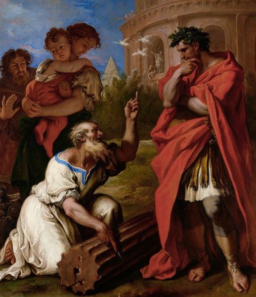 Editor: Paolo Veronese, around the 16th century, with "Emperor Augustus and the Sibyl," likely in oils. It strikes me as so grand, so theatrical... yet there's something oddly vulnerable about Augustus's pose. What draws your eye when you look at this piece? Curator: Vulnerable indeed! Perhaps because Veronese captures a Roman leader brought low, acknowledging an otherworldly authority in the Madonna overhead and presented by the Sybil! It’s a fascinating push and pull, isn’t it? Divine revelation versus earthly power... like the world holds its breath awaiting the answer. I also can't help but be seduced by that play of architectural forms...are you following that drama, those arches that suggest mystery? Editor: Yes! It almost feels like a stage set! And that little glimpse of a Madonna figure nestled into the architecture... it adds such an unexpected layer! Curator: Exactly. Veronese uses all this baroque staging to set the scene for faith and destiny to play their roles. But how real do you feel these characters are, the protagonists in this grand drama of old becoming new? Editor: I think that maybe there are people like us… a regular student or curator happening to be on an adventure! It feels timeless. Curator: Precisely! You feel invited to consider, just as Augustus must have, what awaits us all on our own, unknown paths! What a world to imagine ourselves into! Editor: This feels like I have been thrown in this setting. Like a historical drama or movie almost... Curator: So much we see around us started in settings such as the ones here, with Veronese allowing the curtain to rise before our very eyes.
