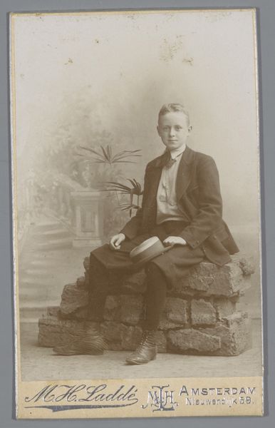 Editor: This is an albumen print by Jan Goedeljee, titled "Portrait of a Boy with a Book on a Table, with a Pedestal in the Background," dating from sometime between 1860 and 1905. The boy's gaze is intense, almost unsettling. It makes me wonder about childhood during this time. What strikes you about this image? Curator: It's fascinating how portraiture like this served a critical social function. Photography in the late 19th century democratized portraiture, but also standardized it. These weren't just pictures; they were status symbols. Think about it – who was commissioning these images, and why? Was it simply documenting a child's likeness, or conveying a certain image of the family? Editor: So, you’re saying it’s less about capturing the boy’s true personality and more about projecting an ideal? The book, for example—is it about actual learning, or merely an accoutrement of upper-class life? Curator: Precisely! Notice the staged quality—the potted plant, the backdrop. These elements aren't incidental. They signify cultivated taste, prosperity, and access to education. It’s a carefully constructed performance for the camera. Consider who this image was *for*. Albums were public displays within the home, intended to reinforce social standing. The circulation and display is essential to its meaning. Editor: That adds a whole new dimension. It’s not just a portrait; it’s a form of social communication. I never considered how “public” a family album actually was back then. Curator: And consider the boy’s somber expression, which was conventional, but what did this convey, and for whom? Does this represent some tension of image creation as well, or a new social construction of masculinity in that time period? Editor: This really makes me rethink how I approach historical portraits. It’s not enough to simply see the subject; you need to understand the entire social and cultural context in which the image was produced and consumed. Curator: Absolutely. Thinking about images this way transforms a simple portrait into a window into the complex social dynamics of the era.