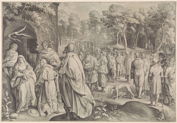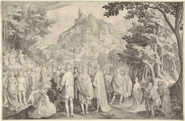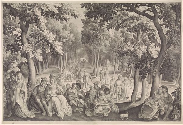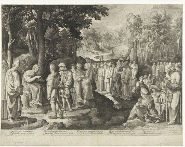 Curator: The scene feels both meticulously crafted and strangely serene, doesn't it? Editor: Indeed. I am struck by how skillfully Nicolaes de Bruyn wields engraving in "Prediking van Johannes de Doper" from 1619. You can almost feel the forest floor underfoot. Curator: It's the texture he coaxes from the metal, a directness to the act of mark-making. I mean, you've got the obvious foreground, but there’s real labor embedded in that process of hatching, and creating those dense layers in the background. Each figure emerges because of the hand. How were these engravings received in the public sphere? Were they considered readily accessible artworks? Editor: Prints such as this circulated widely, fostering a visual culture deeply entwined with religious and moral teachings. The Rijksmuseum houses this particular engraving today, but back then, consider its original social function; religious instruction, moral guidance, artistic expression—these prints carried significant weight in public discourse, especially given that they were comparatively affordable. Curator: It’s interesting to think about the materials again – copper plates, ink, paper - versus the monumental, biblical weight the image is designed to carry. It democratizes religious narrative, but by employing costly artistry. This feels very deliberate, a tangible product accessible to an emergent, moneyed, mercantile class. Editor: Absolutely, we must acknowledge the role of institutions, like the Church and wealthy patrons, in commissioning and disseminating such images. But also we need to realize the power these images have once they are dispersed. The Reformation saw a massive surge in printmaking and circulation, challenging the singular narratives the Church traditionally maintained. Seeing art, teaching, being inspired, and spreading knowledge would've been deeply affected. Curator: So, we can see the distribution as both a mode of religious indoctrination and a subversive mode for exchanging nascent ideas? That sort of paradox is part of the point here. What really strikes me about de Bruyn's approach is the interplay of process, production, distribution. All are intertwined. Editor: Precisely, understanding the historical context illuminates how artworks function beyond mere aesthetics; they actively participate in societal shifts and dialogues. That interplay you mentioned created fertile ground for social and cultural change. Curator: A remarkable print, especially considered from our distinct perspectives, isn’t it? Editor: Agreed. "Prediking van Johannes de Doper" encapsulates both the power of visual communication and its integral connection to societal transformations.