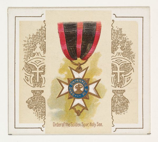 Curator: Looking at this delicate print, what first captures your attention? Editor: It evokes a strong sense of honor and tradition, despite its small size. The medal's sharp lines contrast with the ribbon's softness and suggest formality. What exactly are we looking at here? Curator: This is a chromolithograph entitled "Order of the Golden Spur, Holy See," part of the "World's Decorations" series produced by Allen & Ginter in 1890. It’s a small card, made with watercolor, colored pencil, and print, that was originally included in cigarette packs. Editor: Allen & Ginter cigarettes, an odd association. It's fascinating how these ephemeral objects can hold and transfer meaning across generations. I'm especially interested in how it represents power structures of the time, colonialism, and religious influence as embedded in everyday life through tobacco use. How does the order itself relate to papal history? Curator: The Order of the Golden Spur has a rich and complex history linked to the papacy and knighthood, representing different phases of papal authority. Editor: Notice that cross and crown iconography. Even down to the fine details, these emblems are deeply symbolic. Do the colors hold significance? The black and red feel quite deliberate, almost dramatic against the white of the cross. Curator: Definitely. Red often signifies valor, sacrifice, and even martyrdom, while black can evoke power and solemnity. Together, in this context, they bolster the order's gravitas. It certainly invites questions about what it means to be recognized for actions condoned or promoted by religious institutions. Editor: Looking at it this way invites dialogue on ethical complexities—knighthood as it aligns (or conflicts) with modern ideals of justice and equity. It underscores the inherent contradictions within symbols of power and privilege. Curator: I agree. Its place in popular culture makes it an accessible, even provocative entry point into considering these complexities. Thanks for your insights! Editor: Likewise. Exploring how symbols retain and adapt their meaning is a really rewarding journey.