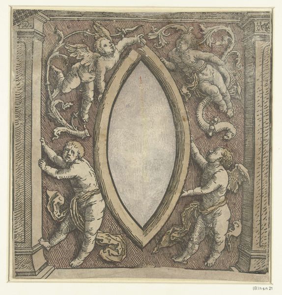 Editor: This drawing is titled "Ornament met offerende Vestaalse maagd" by Elias van Nijmegen, created sometime between 1677 and 1755. It appears to be pen and ink on paper. I'm struck by the symmetry of the composition, with the central scene framed by these ornate decorations. What do you see as the most important formal elements in this piece? Curator: Indeed. The composition relies heavily on symmetrical balance, almost as a mirror effect pivoting from the central scene of the Vestal Virgin. Observe how the artist manipulates line, primarily through the pen and ink medium, to create a clear distinction between foreground and background elements. The use of hatching and cross-hatching defines the volumes and textures of objects such as the urns, figures, and garlands, whilst creating subtle gradations in tone. Consider how these formal choices contribute to the clarity of design? Editor: I see what you mean. It's almost like a stage set. The artist used a light yellow background to let the central emblem and figures stand out. What can you tell me about the curves and lines? Curator: The use of curvilinear forms is very much representative of the late Baroque, or Rococo sensibility. Note the sinuous lines defining the arabesques, scrolls and flourishes decorating the outer registers of the picture. Also observe that there is careful distribution of weight: darker areas and details around the centre drawing your eye toward that spot, as a compositional anchor. Editor: So, it’s really all about how the artist used the elements of art and principles of design to create this visually balanced and decorative piece? Curator: Precisely. While allegory and historical context provide layers of meaning, it's the interplay of line, form, and balance that provides its intrinsic aesthetic value. It transcends beyond just religious iconography. Editor: I see, I learned so much. Thank you!