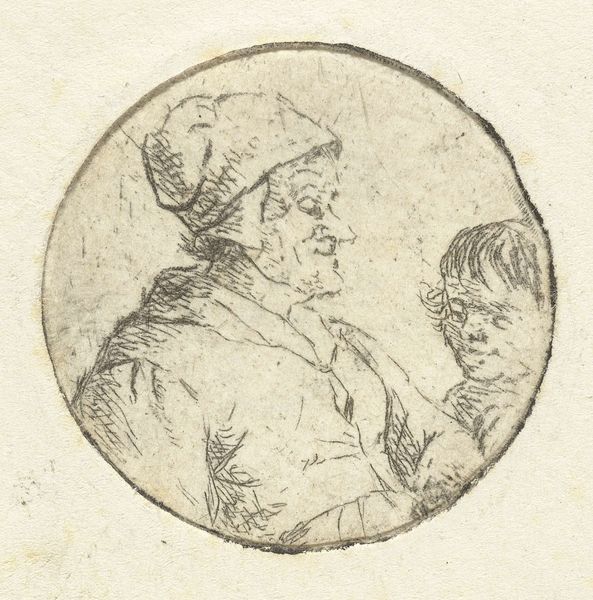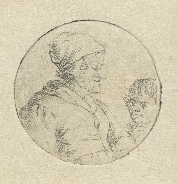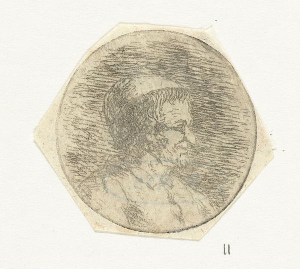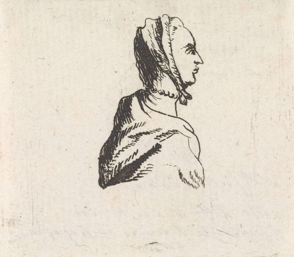 Curator: Ah, yes, Christina Chalon’s “Buste van een onbekende man,” dating from somewhere between 1758 and 1808. It’s currently housed right here at the Rijksmuseum. A delicate ink drawing on paper, it’s rendered with an economy of line. Editor: There’s an intriguing contrast here. A sense of quiet melancholy radiates from him. Despite the apparent haste of the mark-making, there’s a profound, almost weary weight about this anonymous fellow. Curator: That immediacy comes from Chalon's striking linear technique. You feel she's really capturing a fleeting glimpse. And anonymity itself, that's key here, isn’t it? It invites us to project… perhaps stories of everyday struggles, ordinary dignity. Editor: The rough, almost frantic hatching in the background seems to both isolate him and suggest an inner turmoil. I wonder about the head covering. It doesn’t signify rank or profession overtly. More an everyman quality, linking him to historical archetypes of contemplation and quiet resilience. Curator: Interesting point about the head covering. It certainly removes him from the realm of aristocratic portraiture that was prevalent at the time. He isn't presenting an image of wealth, so is that cap meant to connote a profession, a community or just a degree of vulnerability? The symbol feels decidedly inclusive rather than exclusive. Editor: There’s something innately comforting in seeing a face marked by time. Each line, each wrinkle carries its own symbolic load—narratives etched onto the very surface. The lines may suggest hardship but the sitter shows resilience. Curator: Chalon beautifully portrays an introspective dignity, revealing the character beneath. Editor: Yes, a silent, universal narrative of endurance etched in ink, whispering across centuries. He stands as an emblem for the enduring power of the individual spirit.