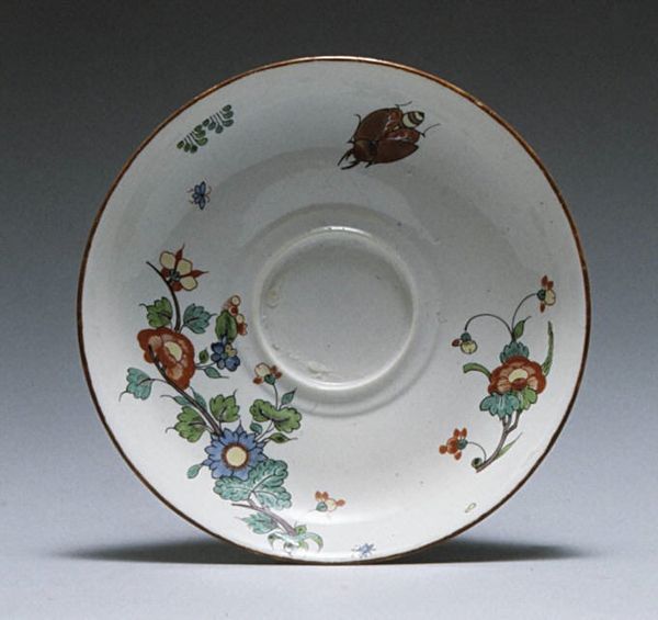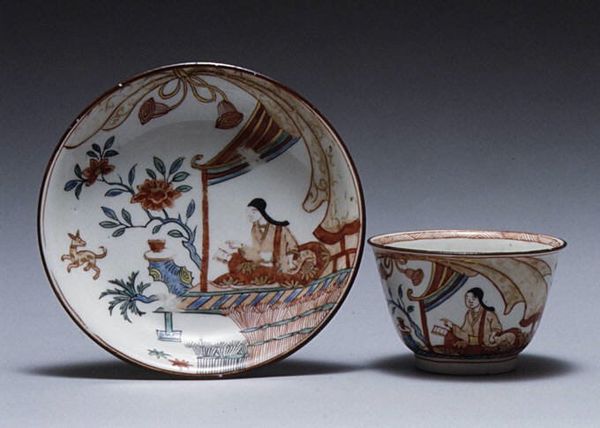Curator: Let’s turn our attention to this exquisite cup and saucer from the Saint-Cloud factory, dating back to the mid-18th century. It’s currently held at the Metropolitan Museum of Art. Editor: It’s dainty, isn't it? The scalloped edges give it a certain playful elegance. There's something inherently calming about seeing a tea set; the simple, clean ceramic invites ideas about refinement and contemplation. Curator: Indeed. The piece is porcelain, placing it within the tradition of highly prized materials. Saint-Cloud was one of the earliest French factories to successfully produce soft-paste porcelain, and they closely guarded their recipes. The labour involved would have been intense, from sourcing the materials, compounding the paste, molding, and carefully firing to avoid shattering... Editor: Let's look at the symbols. The floral patterns and what seem like highly stylized rockwork... how do you interpret those elements, Curator? Is it a direct response to East Asian porcelain motifs that were so trendy at the time? Curator: Very perceptive. These designs directly reflect an appropriation of East Asian designs fashionable in Europe. Note also the implications of these images travelling along established trade routes. They indicate economic conditions that made it all possible and who had access to this type of object at that time... Editor: It also whispers of colonial legacies, doesn’t it? Taking and adapting aesthetics like this... beyond commerce it implies cultural dominance. The act of drinking from this cup becomes tied to these layered histories, this exchange –or really extraction. Curator: Precisely. Consider how owning porcelain tableware, especially something of this delicacy, signaled a certain status in the eighteenth century. Its physical presence within a household conveyed values... Editor: It seems every delicate petal and precisely rendered branch carries cultural meaning. The rococo style with its asymmetrical balance creates this sense of fantasy but also subtly conveys that world that produced it –its values, aspirations, and shadows. Curator: It is amazing how such an unassuming set holds the echoes of broader social and economic structures. Editor: It's a beautiful artifact of material culture that’s rife with symbolism.