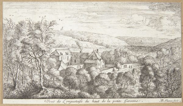 Editor: This is "Udsigt over la grande Garenne nær Longuetoise" by Albert Flamen, made sometime between 1620 and 1669. It's an etching, so ink on paper. I'm struck by how detailed and expansive the landscape feels despite the limited tonal range. What stands out to you? Curator: The effectiveness of line in creating depth is particularly noteworthy. Notice how the varying densities and directions of etched lines describe form and recession. Can you see how the foreground elements are rendered with thicker, more closely spaced lines, gradually diminishing in the background? Editor: Yes, I see that now. It’s almost like he’s manipulating our eye, forcing us to focus on what's closest. Is there a name for that technique? Curator: Formally, we can describe this as a sophisticated use of linear perspective combined with an understanding of atmospheric perspective – simulating depth through progressively less distinct forms. The precision and control exhibited in the etching technique also elevates the composition. Note the crispness of the architectural details versus the more diffused texture of the distant hills. Editor: The detail is pretty incredible, especially considering it's an etching. So, is the formal success mostly from this contrast in the line work? Curator: It is the dominant visual component. However, observe also the composition's overall balance. The placement of the building is off-center, but still offers a grounded stable anchor for the busy, bustling activity in the field. Do you think the structure supports the overall visual success? Editor: That’s a good point. It feels less like a picture *of* something and more like a record *of* a place and its energy, as a result of that balance. Curator: Precisely! The formal elements converge to offer not just a representation, but a distinct visual experience, a certain vitality in the image, brought alive by the etching medium. Editor: I see it now! This breakdown makes me appreciate the artist's technical skills a lot more. It's more than just a pretty landscape.