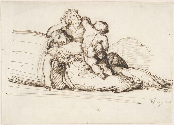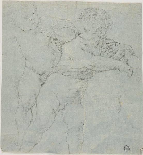 Curator: This drawing, held here at the Rijksmuseum, is entitled "Studie van twee naakte mannen," or Study of Two Nude Men, attributed to François Boucher, and likely dating from 1713 to 1770. Editor: The tonality of this work is immediately striking, isn’t it? A sort of sanguine softness amidst the raw anatomical study, a somewhat detached view. Curator: Indeed. Note the clear, concise lines and precise shading—hallmarks of Boucher's Rococo aesthetic blended with academic draughtsmanship. The composition, however, reveals a study in contrasting forms. The standing figure dominates the composition from above. The one sitting assumes a submissive posture, which makes an interesting symbolic dynamic. Editor: I am drawn to the choice of medium here; dry media upon toned paper—we see the artist wrestling with immediacy, with capturing form almost impulsively. It speaks volumes of studio practices. Was this study intended for a larger work or valued in itself as material culture? That’s always on my mind. The labor inherent in creating these lines intrigues me as much as the final representation. Curator: Perhaps it's both. We know the Ancients had significant impact on the master, the emphasis on figuration and mastery of human form reflecting a debt to classical ideals that permeate Rococo. One must note, however, that such mastery over line and shadow can often become its own end. Editor: Precisely! How was it distributed? Who consumed these images of masculinity, and how did their interpretation hinge on the class and gendered views of the consumers? And the material conditions—were high-quality materials used, signifying artistic importance, or were these humble preparatory sketches on inexpensive supports? Curator: While the drawing evokes complex cultural interpretations that would have dictated consumption during its making, to be caught up in such analysis obscures how powerfully such works address core questions surrounding beauty, ideal form, and aesthetic experience. Editor: Perhaps. But I think the social, economic, and even the ecological footprint left by artwork cannot be disentangled from how beauty is seen—the materials, workshop, labor…it shapes beauty more than some realize. Curator: Well, our analyses reflect, as much as challenge, the work's enduring impact.