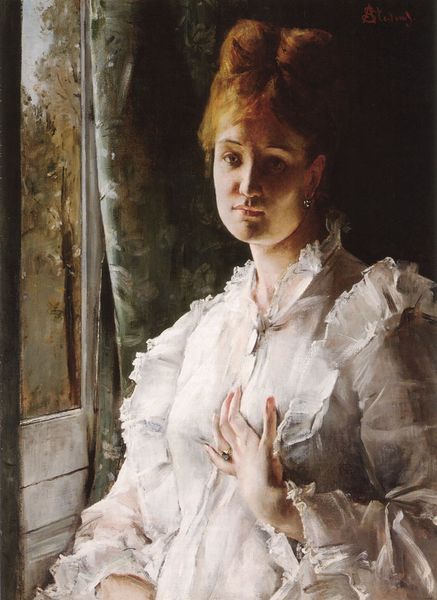 Editor: Alfred Stevens' "Young Woman in White Holding a Bouquet," made sometime between 1865 and 1875, has this really soft, romantic feel. She looks like she’s waiting for something. What do you see in this piece? Curator: What strikes me is the way Stevens positions the woman within a liminal space, an intermediary zone between interiority and exteriority. We have this woman, adorned in white, a symbol of purity, yes, but what does it mean for a woman of that era to be framed by both the domestic space behind her and the natural world outside? Is she free, or is this just another gilded cage? Editor: I hadn't thought about the cage metaphor, but now I see how the doorway kind of acts as a barrier too, even though it's open. Is the bouquet part of this symbolism? Curator: Absolutely! The flowers themselves are a symbol of delicate femininity but also represent the limited roles ascribed to women, their "value" often reduced to their beauty and decorative function within a patriarchal society. Who is she holding the bouquet for, and who is its beauty really for? Consider also the texture of her clothing: white, seemingly modest, but luxurious, almost bridal. Does the scene speak to agency or its lack? Editor: So it’s not just a pretty picture; it's making a statement about women's restricted roles, even within this sort of idealized image? Curator: Precisely! It pushes us to consider how images can reinforce social constructs and power dynamics, even when they appear seemingly innocent. Editor: That gives me so much to think about! I was initially drawn to the colors and light, but seeing it in the social context is eye-opening. Curator: That’s the power of art history – not just what is depicted, but why and how. Hopefully it will spur some broader conversations around women, identity and politics.