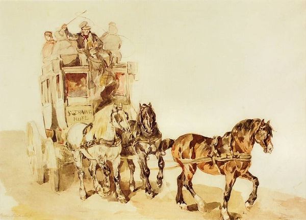 Aurelio Tiratelli created this small oil on panel depicting a cart with farmers and buffaloes from the Maremma. The painting presents a pastoral scene divided into distinct horizontal bands. The earthy tones of the foreground, dominated by the road and the figures, contrast with the expansive blue sky above. Notice how the composition is carefully structured, with the strong horizontal line of the horizon emphasizing the flatness of the landscape. The dark masses of the buffaloes provide a visual anchor, balancing the lighter, more diffuse forms of the figures on the cart. Tiratelli uses the formal structure of the painting to create a sense of balance, yet within this order, subtle details such as the textures of the animals' coats and the varied poses of the figures, introduce a sense of movement and life. These elements disrupt the static nature of landscape, suggesting a narrative and engaging the viewer in a dynamic visual experience.