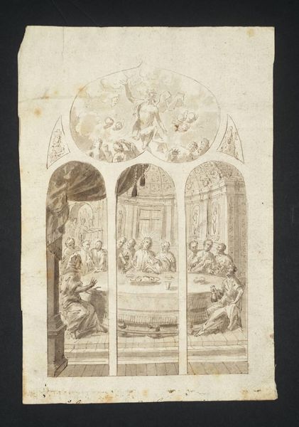 Curator: Take a look at this undated sketch, attributed to Reuben Townroe, who passed away in 1911. I am struck by the preliminary nature of its composition, the very visible scaffolding of lines that build the architecture. Editor: It evokes a sense of quiet contemplation despite its incompleteness; the muted colors and huddled figures suggest introspection and shared, perhaps somber, reflection. Curator: The use of watercolor and pencil creates depth, focusing our attention on the figures nestled within what appears to be an arched niche. Note the dynamic balance achieved through the arrangement. Editor: Who are these figures, though? I wonder about their position within the church or institution Townroe was working for. Are they simply observers, or do they embody specific roles within the community? Curator: Regardless, the semiotic structure is clear: the arch enframes them, suggesting protection or perhaps even confinement within established hierarchies of sacred space. Editor: Perhaps. It's a poignant reminder that even within seemingly serene settings, power dynamics and social structures are always at play. Curator: An astute observation. The formal structure here is both pleasing and thought-provoking. Editor: Indeed. Townroe’s sketch offers a layered glimpse into a world where outward appearances often mask complex inner lives.