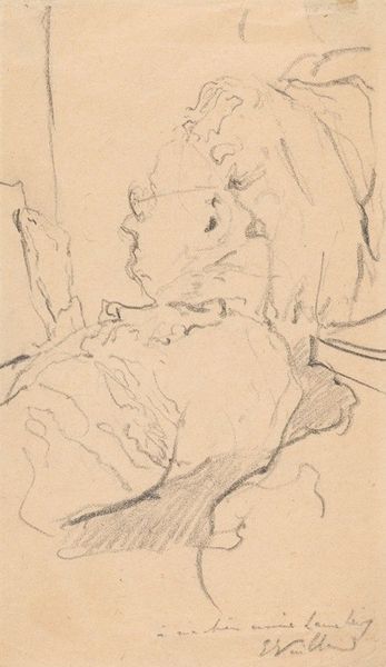 Curator: Lovis Corinth, the artist, he really captured the grimness in this rendering of Absalom, hanged from the tree. What strikes you first? Editor: The sheer desperation! It's palpable, like the charcoal is screaming. It feels unfinished but that’s the point, right? He’s suspended, caught. Curator: Precisely. This work depicts the biblical scene from Samuel, where Absalom's hair gets caught during his escape, leading to his capture. The rough strokes, the dramatic contrast... Editor: It’s like Corinth is saying, “Here’s the horror, raw and untamed.” The composition itself, the dark figure against the pale ground, is stark, almost brutal. Curator: The unfinished quality lends itself to the tragedy, and the quick strokes suggest the suddenness of the event. It's interesting how much emotional weight Corinth puts into such a small work. Editor: Absolutely. And it is that incompleteness that stays with you, isn’t it? Like a question left unanswered. The horror of the story lingers. Curator: It certainly does. Corinth masterfully leaves us with that haunting echo.