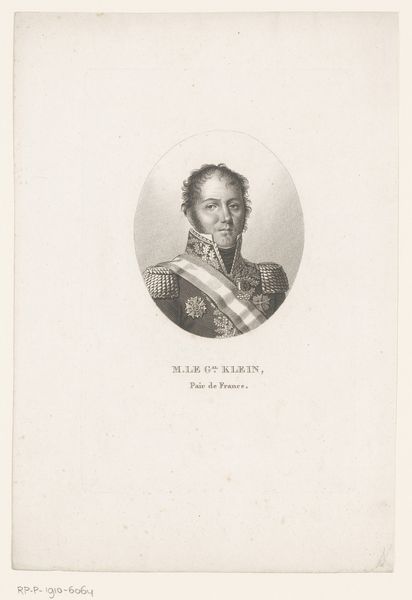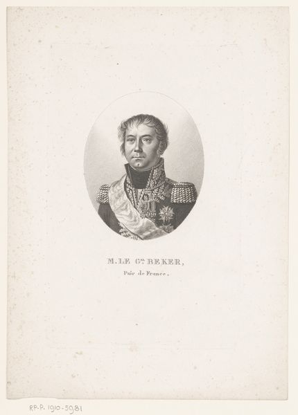 Editor: Here we have Ambroise Tardieu's "Portret van Antoine-Guillaume Rampon," an engraving on paper created around 1820-1821. It’s quite striking. The level of detail in the uniform is incredible, but something about the stark contrast makes it feel almost severe. How do you read this portrait, focusing on its formal elements? Curator: A rigorous examination of its structure reveals much. The oval frame isolates the figure, forcing attention onto the bust. Consider the tonal range: the artist employs sharp contrasts, primarily black and white, to model the forms and articulate details, almost a sculptural precision achieved through line work. The meticulously rendered embellishments of the general's uniform serve not just as decoration but as symbolic indicators of status and authority, meticulously rendered through precise hatching and cross-hatching techniques. Does the sharpness in detail not amplify the authoritative essence? Editor: I see that, yes. The precision definitely lends itself to that reading. But the starkness, is that simply a product of the engraving process itself or does it convey something more? Curator: That is insightful. The starkness serves both practical and aesthetic purposes. Engraving, by its very nature, emphasizes line and tonal contrast. It allows for controlled detail, thus aligning with the Neoclassical pursuit of clarity and order. In what other aspects of the composition do you observe a similar controlled structure? Editor: The symmetry, I suppose. The figure is presented almost dead-center, everything is carefully balanced within that oval frame. The stern look and upright posture amplify the idea of calculated and careful authority, and precision of this era, I guess. I had not considered it like that! Curator: Precisely. Through controlled composition and technical mastery, Tardieu delivers not just a likeness but a powerful declaration of rank and decorum. A truly remarkable work, upon reflection. Editor: Agreed, understanding how the engraving technique itself and symmetry reinforces the subject's stature changes the experience quite a bit.