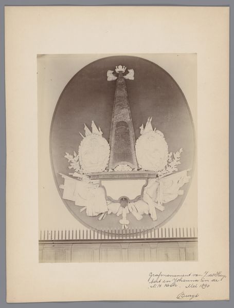 Curator: What strikes me first is how ghostly it appears, like a memory fading away. Editor: Indeed. We're looking at an 1893 photograph, likely taken by an anonymous photographer working with Monumentenzorg, depicting the grafmonument, or grave monument, of Steven van Welderen in the Grote of Sint-Maartenskerk in Tiel, Netherlands. Curator: It’s almost monochromatic, bleached of colour, which heightens the ethereal mood. It looks sculpted, perhaps marble or some kind of plasterwork? So tactile but at the same time untouchable. Editor: The material of the actual monument would indeed be very informative to know. We can see the sculptural relief showing figures, maybe allegorical, angels too. Considering its placement within a church setting, materials like marble or limestone, signifying permanence and status, would certainly have been deliberately chosen to communicate social power and, ultimately, transcendence of earthly labor. Curator: Transcendence... yes, that's what the verticality of the piece suggests to me, all these little cherubs, they seem to climb towards heaven. Is that what they're telling us, you think? We shall all become cherubic after our death. I wonder about Mr. Van Welderen himself. Did he choose it, or did someone do this in his name? Editor: The choices of monument and artistic expression were certainly tied to social practices and commissioned patronage. Who paid for this, and why this particular form was chosen reveals volumes about the means of both artistic production and memorialising power. We might also ask how these material choices resonated with church-goers; were they moved by displays of piety and power through art? How has it changed over the century between its making and now? Curator: So true. The context really shifts everything. Now I'm viewing it as both a place for devotional viewing but a declaration of civic and economic achievement. A double-edged memorial. Editor: Exactly! The nuances are embedded in the materiality. The choice and means communicate something much larger, I find. Curator: What a thing to contemplate… almost makes me wish to see the monument itself, to touch it with my own hands, and try and capture some truth of the artwork through that sense. Thanks!