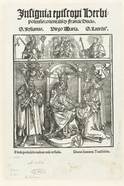 Editor: This woodcut, “Mater Dolorosa,” dates to around 1503 and is by Joost de Negker. I believe it’s housed at the Minneapolis Institute of Art. There’s an immediate sense of grief, almost a suffocating feeling with the swords and the dense detail. What strikes you when you look at this, what’s the key to understanding its resonance? Curator: Oh, absolutely, it’s a real heart-punch, isn’t it? What grabs me is the intimate choreography between Mary, the splayed swords, and those surrounding scenes, those medallions encircling her. Consider the Seven Sorrows of Mary, you see, all playing out like chapters of a devastating biography right there. She’s not just a passive recipient; she’s embodying the emotional and spiritual consequences of each event. Look how her drapery swirls, as if echoing the torment within! I’d wager, did the severity and linear density used create an almost feverish energy in its time? Editor: I hadn’t really focused on how active the drapery appears; it seemed just like detail to me! You know, now I am noticing the connection to the scenes; the swords sort of point at the smaller events surrounding her. So, it's about visually linking her emotional state to the key moments in the story of Christ? Curator: Precisely! But beyond mere illustration, there’s this fascinating push and pull between the personal and the theological. De Negker seems to encourage each of us to insert our emotional truth into each event, thus into Her heart. What do you take from that? Editor: Hmmm, a devastating biography is about linking shared experiences in her and the viewer’s minds to give comfort! Curator: You found that right out; I felt your response too.