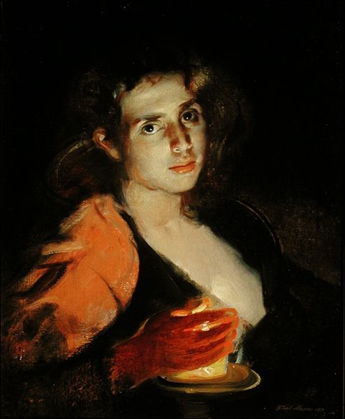 Józef Mehoffer made this small portrait, Meduza II, with oil on cardboard, and I love how intimate it feels. I think he's exploring something about the performative aspects of painting, and how you work with an idea or person, not just 'copying' it. The brushwork in the background, those warm hues against the black, is so full of energy. It's like Mehoffer is letting us see the painting come into being, not just presenting a finished image. And the color palette, those rich reds and golds against the dark fur, it's like a conversation, a visual push and pull. It feels so good and I want to get inside the feeling of it. Thinking about the physicality of the paint, especially in the face, I imagine him building up layers, scraping back, letting the surface tell its own story. You can almost feel the pressure of his hand, the give-and-take between artist and material. This makes me think of Klimt’s portraits, the way he combined realistic depictions with abstract patterns and decorative elements. Art is just one big conversation across time.