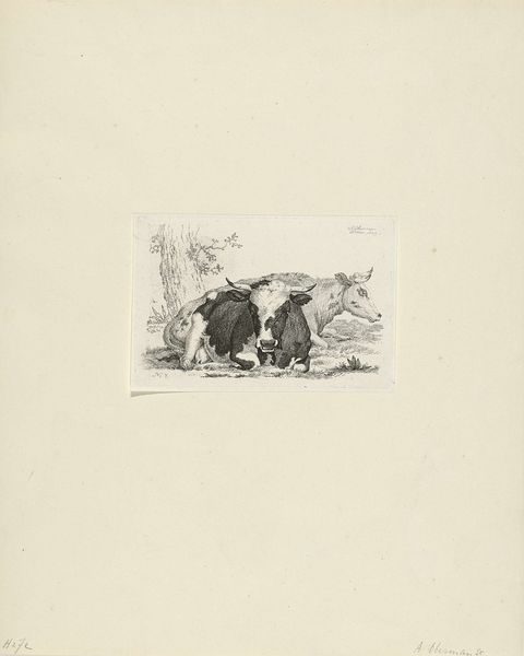 Editor: So, this is Francesco Londonio's "Shepherd Sleeping, Watched by Cattle." It looks like an etching. I’m struck by how calm it feels, but also a little melancholic. What do you see in this piece? Curator: I see a careful construction of pastoral myth, perhaps masking deeper social tensions. Consider the shepherd’s vulnerability versus the cattle’s implied economic power. How does this resonate with historical power dynamics? Editor: I never thought of it like that. So, the scene isn't just peaceful; it's also about class? Curator: Precisely. The art historical context reveals that idealized images of rural life were often consumed by urban elites, obscuring the realities of rural labor. Food for thought, isn't it? Editor: Absolutely. It's amazing how much a simple image can hold. Curator: Indeed. Art invites us to question, to unearth the layers of meaning embedded within.
