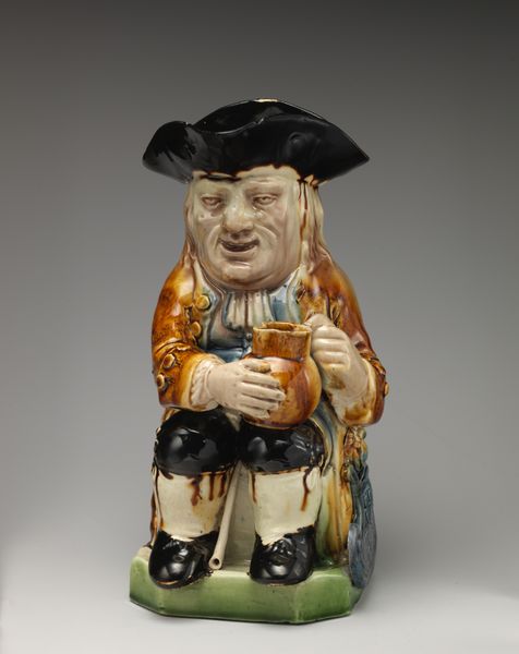 Curator: Here we have a ceramic Toby jug made between 1775 and 1785, attributed to Ralph Wood the Younger. These jugs were popular in the late 18th century. Editor: My first thought is cozy, maybe a bit mischievous! He looks like he has stories. I’m drawn to the muted glaze – not quite gaudy, but pleasantly worn. Curator: They certainly tell stories, although some of them are darker than one might expect. Toby jugs like this one emerged during a time of significant social and political upheaval. The consumption of ale was very much part of working-class social life. Editor: Makes you wonder what kind of ale was brewed back then, eh? I imagine dark and very bitter. He is quite self-satisfied, I think. The composition's vertical thrust almost makes it seem he might spring up at any minute and give you his opinion on, oh, colonial tax policies or something. Curator: Exactly. And while appearing convivial, it’s important to acknowledge that the commercialization of alcohol, evidenced in these figures, coincided with issues like poverty and exploitation. Some jugs even served as political caricatures. Editor: Interesting. So, this fellow might have been subtly taking the mickey out of someone? You know, when you see art in a museum you often forget it could be everyday objects loaded with satirical jibes. Art can be a quiet, biting revolution, eh? I'll raise a glass to that. Curator: Indeed. While we can appreciate the craftmanship and this work as a prime example of decorative art, it’s essential to consider the complex social and political dynamics they often reflect, revealing tensions and anxieties within 18th-century British society. Editor: I like knowing he carries all that weight, beneath his jovial surface. Gives the jug more layers than you might imagine, at first glance. Curator: Absolutely, an everyday object infused with history.