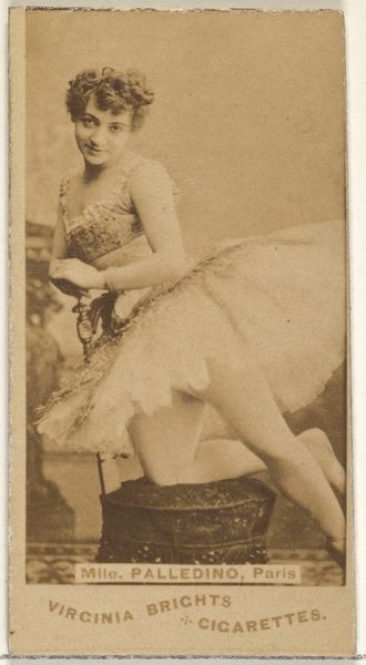 Curator: Let's discuss "Mlle. Brambilla in 'Excelsior'," a print dating between 1886 and 1890, produced by Goodwin & Company. It is a promotional card for Old Judge Cigarettes and is currently held in the collection of the Metropolitan Museum of Art. What strikes you upon first viewing? Editor: The overwhelming sense of ethereality, despite being a promotional print. The pose, the sepia tones, it all contributes to a fleeting, dreamlike state, captured as a lasting aesthetic impression. Curator: Precisely. Let's consider the conditions of production. These cards were churned out en masse as advertising ephemera, cheap giveaways packaged with cigarettes. To what extent does knowing the origin influence our appreciation of it as art? Editor: Not in the least. The pictorial balance, the almost photographic clarity—these exist independent of its commercial function. The careful arrangement of light and shadow defines its form. Curator: I disagree, somewhat. To fully understand this image, you must recognize its intended role. The card presents an idealized, glamorous vision meant to elevate the Old Judge brand, appealing to consumer desires for luxury and artistry in their everyday life. The value lies in observing its interaction between artistic merit and marketing strategy. Editor: Even still, look at the execution, the subject is a vision. There's an elegant formality in the ballerina's graceful bearing and positioning within a structured visual framework, the curve of her tutu echoing the set decoration. The balance between the human form and negative space is itself evocative, regardless of function. Curator: I concede that the piece succeeds on a purely formal level, despite the intentions of commerce. But dismissing the original commercial agenda obscures the complex interplay between labor, consumption, and representation present at the time. That context adds critical depth. Editor: Perhaps it elevates, instead. It reveals something new about how it represents value. Ultimately, I’m swayed most by how light reflects off her tulle skirt, evoking motion through static image. Curator: Yes, it really showcases a captivating tension. Editor: It seems our analysis, both grounded in materiality and in pure form, is enriched through collaborative viewpoints.