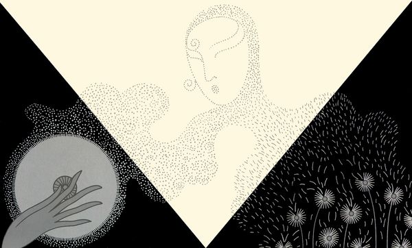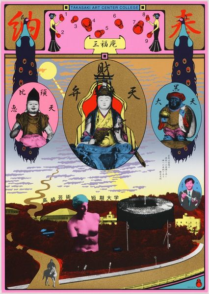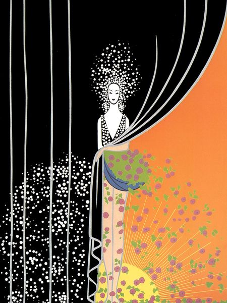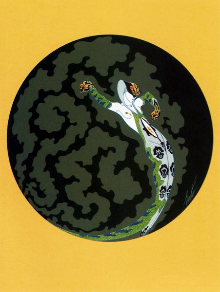 Curator: Erte’s “Selection of a Heart," done in a mixed-media painting technique, pulls you in immediately. It just feels theatrical and glamorous. What grabs you first? Editor: It's like a fever dream, all right angles fighting with sensual curves! That intense yellow is almost unsettling, contrasting with the velvety blacks and swirling patterns. Is this opulence or something darker, masquerading? Curator: Consider Erte’s background in fashion and costume design, those influences bleed into how the artwork focuses on details, elaborate fabrics, and precisely rendered figures. The composition foregrounds decorative elements almost as characters themselves. We can examine it also in terms of production and distribution as it has become emblematic with fashion design since the 1920’s. Editor: Right! Everything feels so painstakingly crafted. It’s interesting how cold and stylized the figure looks—but, look there at the hands presenting these vulnerable hearts pierced by cupid's arrow... There's a tension there, a sense of emotional exposure presented with a veneer of Art Deco cool. Almost mocking vulnerability and ideal love. Curator: The materials play a key role, because Erte has an attention to both line and pattern to highlight mass production potential. Those strong, contrasting color combinations make reproduction easier. Erte, or Romain de Tirtoff, clearly understands this visual appeal will translate to the consumer very directly through printed reproduction as he gains a reputation of high society visual branding. Editor: Hmm. You’re right to observe it. This artist creates a visual brand identity with commercial undertones; this reminds me, what would the feeling be of this artwork without the heavy black inks as foundational outline. Would the feeling come off differently without those details? And perhaps without Erte’s expertise he doesn’t realize the cold art deco feeling could become…sinister? Curator: Perhaps. It’s this intersection of art, labor, and social standing that made Erte's style both accessible and deeply rooted in the cultural mindset of glamour during his peak of work in the late 20th century. His influence as a popular aesthetic makes him historically significant still today. Editor: This image makes me consider the masks we wear to show the world only particular pieces of our true heart. Thanks to this dialogue I am rethinking the idea of love—what an adventure.