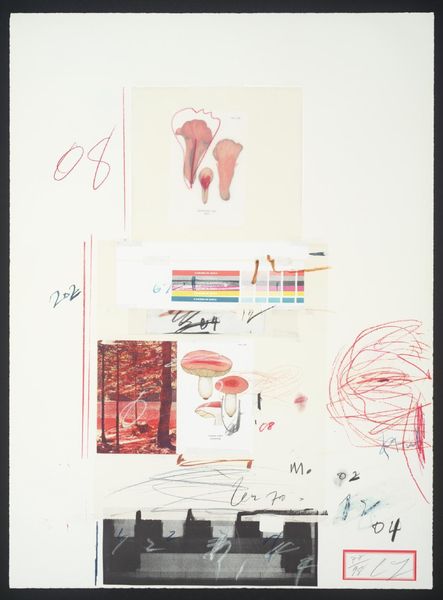 Curator: This is Cy Twombly's "No. X", currently residing at the Tate. It seems to be a mixed media piece on paper, roughly 75 by 55 centimeters. Immediately, I'm struck by its layered, almost chaotic feel. It's like a visual diary entry, all fragments and fleeting thoughts. Editor: Absolutely! I see the mushrooms rendered both as scientific illustrations and loose sketches and the rock photo. It's less about refined artistry and more about the act of collecting, assembling, perhaps even recycling found materials. Look at how the paint swatches interact with the botanical sketches. Curator: I wonder about the social context of these materials. Were they easily accessible? What does the choice of paper, the found images, and even the scribbled text suggest about the artist's engagement with his immediate environment and the culture surrounding him? Editor: Right. It's a record of encounters, of fleeting moments. It doesn't quite resolve into a singular statement, instead it feels like an open invitation for the viewer to sift through the layers, constructing their own narrative. Curator: It makes you consider the labor involved in not only creating the work but also in deciphering its meaning. It’s a collaboration between artist and viewer! Editor: Indeed. Ultimately, "No. X" feels intensely personal yet somehow universally relatable in its fragmented, searching nature.