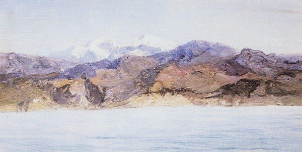 Editor: This is "Coming Down from Mont Blanc," painted by John Singer Sargent in 1911. It’s an oil painting. There’s this imposing mountain range, rendered in such warm, earthy tones, even the snow has a reddish hue. What cultural ideas come to mind when you look at it? Curator: The mountain, a near-universal symbol of aspiration, transformation and the dwelling place of gods. Here, we see Sargent capturing the descent – a return to earth, a re-entry into the mundane after a period of transcendence. It's interesting he titled it so specifically: not simply "Mont Blanc" but "Coming Down From…" As humans we are so eager to scale a symbolic and literal summit, yet, we can’t reside at that height indefinitely, can we? What do you make of the painting's coloration? Editor: Well, it feels unexpected. Instead of icy blues and whites, there's almost a fire in the rocks. It makes the mountain feel more earthly, almost human. Curator: Precisely. Note how Sargent uses impasto to give texture and volume to the rocks, contrasting with the smoother handling of the snow. The image holds a subtle reminder of the tension between heaven and earth, spirit and matter. The mountain’s mineral substance is made fire-like and alive with his colors. Editor: So it’s less about geographical accuracy, and more about a psychological space? Curator: Indeed. Think about mountains in Romantic poetry. Think of Caspar David Friedrich. Mountains can evoke a confrontation with the sublime. The return, though, the *descent* is where we often discover who we've become, what we've learned from the experience. It invites reflection. Editor: I never considered the return as being just as significant as the ascent! Thank you, that was so helpful! Curator: My pleasure. Hopefully, this insight encourages a deeper look at the symbols in our daily lives and their potential for enduring relevance.