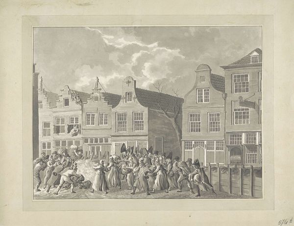 Editor: So, this is "Bezwijking van de bekisting langs de Kortendijk in Gorinchem, 1809," a graphite and pencil drawing by A. Lutz. It depicts a bustling cityscape scene. There's a real sense of activity and maybe even a bit of chaos happening. What jumps out at you when you look at this piece? Curator: For me, it's the documentation of labor and infrastructure using graphite and pencil that’s interesting. We see a group working; likely, this relates to the repairs following some type of infrastructural collapse. We see them, buckets in hand. Editor: Right, and there’s a fascinating contrast. We have the detailed architecture in the background made permanent, almost rigid, by the very pencil that captures the temporary chaos on the street. Curator: Exactly! Consider the availability of graphite and paper in 1809, who was commissioning and consuming such images? It documents the activity and uses those material properties in compelling contrast to the fragility of these buildings. Who is performing the labor? How does this labor facilitate capitalism in that period? How did the cost of these materials define its accessibility for some and not for others? Editor: It’s also compelling how the scene’s almost "genre-painting" realism clashes a little with the formal cleanliness we might associate with Neoclassicism, doesn't it? How do we reconcile that contrast? Curator: Well, how does this capture and, dare I say, romanticize labour, with the style and artistic license of a historical moment? And why do that labor, in particular? Editor: I hadn't considered how romanticizing it might mask something. Seeing it as a question of class and who’s depicted shifts the whole context for me. Curator: Precisely! Focusing on materials, the graphite, the paper, allows us to explore those social and economic forces at play in 1809.