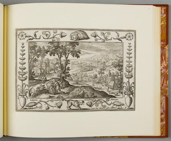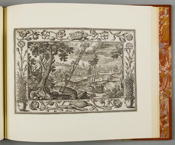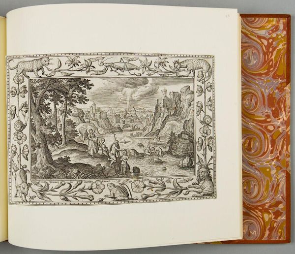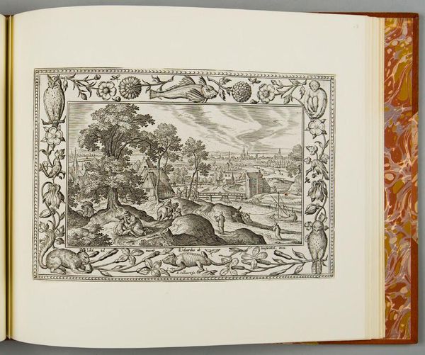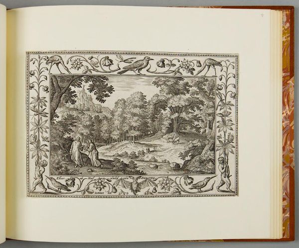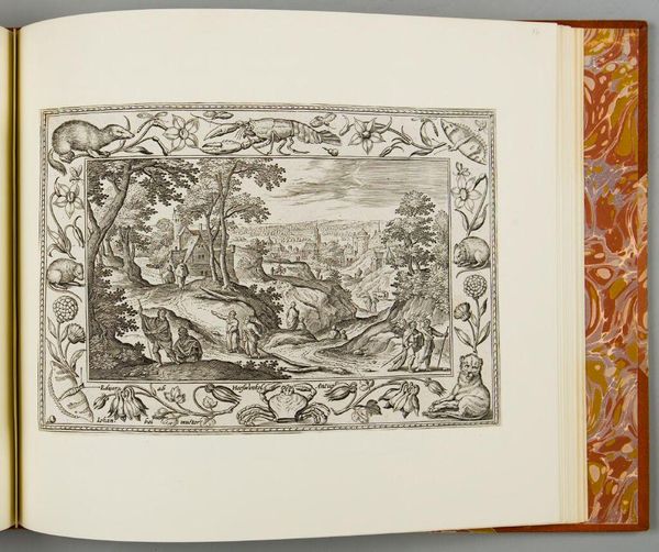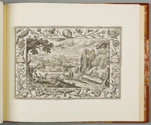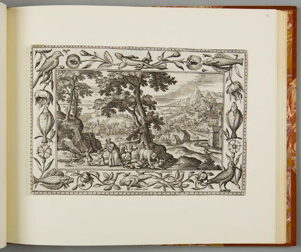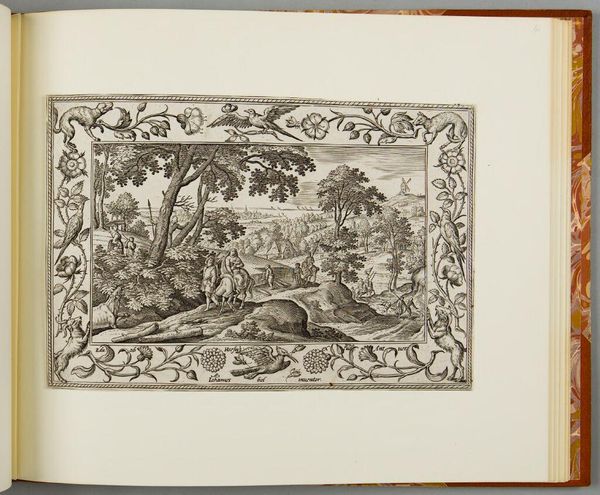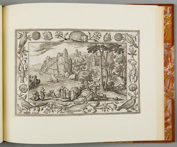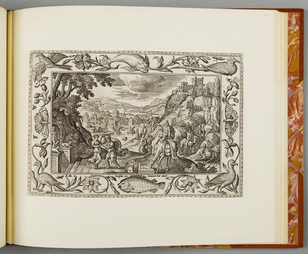 Editor: This is Adriaen Collaert's "Stag Hunt, with Fish, Eagle, Hermit Crab, and Stork," and based on the artist's dates, it's likely from the late 16th or early 17th century. I’m struck by how much is going on within a relatively small space. What is your take on this piece? Curator: Note the highly structured composition. The central stag hunt is framed by meticulously rendered flora and fauna. What purpose do you think the artist intends with this arrangement? Editor: Perhaps to show the bounty of nature? Or maybe to elevate the hunt through the detailed border? Curator: Precisely. The contrast between the dynamic central scene and the static border is key. The use of line and form creates a sense of controlled chaos, an ordered vision of the natural world. Notice the strategic placement of light and shadow. Editor: So, the composition itself conveys a message about humanity's relationship with nature? Curator: Yes, and the visual language provides the necessary key to unlocking the print's deeper meanings. Editor: I never thought about how the border elements could hold so much meaning. Curator: By analyzing the intrinsic components, we gain a clearer understanding of the artist’s overall objective.
