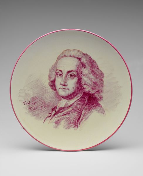 Editor: Here we have "George Washington," created sometime between 1840 and 1883 by Emile Dupont-Zipcy. It's a ceramic plate featuring a sepia-toned portrait. It’s so interesting to see such an iconic figure represented on what's essentially a piece of tableware. What kind of symbolism might be at play here? Curator: Consider the vessel, the plate itself. Throughout history, plates and ceramics are tied to the rituals of gathering, sharing, and communal identity. Now, layer upon it the image of Washington. Editor: So, by placing Washington’s portrait on a plate, is the artist suggesting that he should be part of our daily lives, almost consumed or taken in like nourishment? Curator: Precisely! Dupont-Zipcy is embedding Washington into the French cultural landscape, not just as a historical figure but as a symbol of liberty and republican ideals, readily accessible. Think about the mass production of ceramics during this period. Who has access to this image? Editor: It would allow for a broader range of people to own and engage with a portrait of Washington, wouldn't it? Instead of only the wealthy being able to commission or buy painted portraits. Curator: And what about the choice of a classical style portrait on a relatively "new" technology for art and mass reproduction. Do you see that linking Washington back to earlier "great men" of history? Editor: Definitely! Presenting him in this classical, almost Roman, style, it connects him to a lineage of leadership and strength that resonates through the ages. This humble object has so much encoded history. Curator: Exactly! It's a fantastic example of how everyday objects can carry profound symbolic weight. I've never thought of historical figures becoming literally ingrained in daily rituals!
