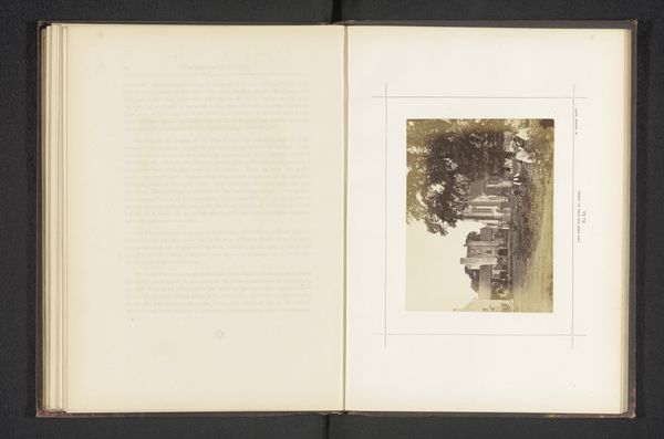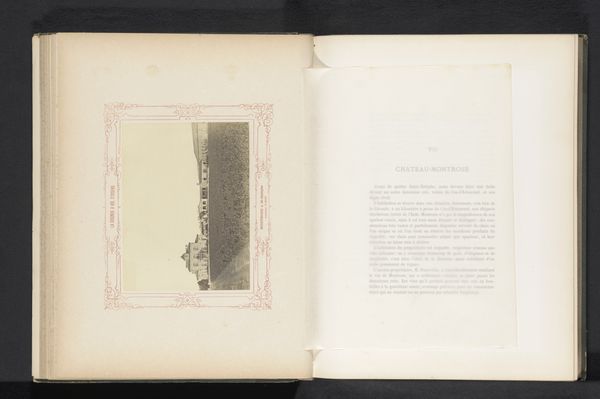 Editor: This is a fascinating print, titled "Gezicht op Château Belgrave in Saint-Laurent, Frankrijk," taken by Alfred Danflou sometime before 1867. It’s an albumen print mounted in an album. It almost feels like finding a hidden world within these aged pages. What aspects of this image grab you the most? Curator: You know, it's funny, I'm immediately struck by the silence radiating from this image, like holding a forgotten thought in your hands. This Château, so deliberately captured, what stories could it whisper? Look at how the light plays upon the stone; can you sense the weight of history there? Editor: Definitely, the way the photograph is framed within that ornate border adds to that feeling. Were these kinds of landscapes common at the time? Curator: Absolutely! Think of it as the Victorian era's version of a postcard. A way to document one's travels, to possess a piece of a place. Do you see how the artist balances technical skill with a desire to capture something more – an atmosphere, perhaps, a sense of place beyond just bricks and mortar? Editor: I do. The longer I look, the less it seems just like documentation. Curator: Indeed. These images are a doorway into understanding the past, not merely what it looked like, but how people *felt* about it, what they chose to immortalize. Editor: So, in a way, it is both historical document and personal expression. I never thought of it that way. Curator: Isn't it wonderful? It shows that, even in capturing the seemingly objective world around us, the artist's subjectivity always subtly guides the view. Every photograph carries within it the unseen soul of its maker. Editor: That really makes me see it differently. Thanks for sharing your perspective!
