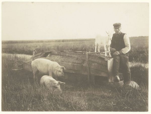 Editor: This gelatin silver print, titled "Jack Gralloching a Stag," was taken between 1856 and 1858 by Horatio Ross. The scene is undeniably somber, with a hunter and a slain stag taking center stage. It feels very intimate, like a private moment captured in a large open landscape. What strikes you when you look at this piece? Curator: The intimacy gets me too, actually. It is so unvarnished! Think about it: photography was still a relatively new medium. This wasn't painting, striving for some kind of idealized version of reality, or romantic hunting scene with clean lines and posed subjects, and here we have someone gralloching, that is, disemboweling, their kill, which brings a gut punch – a strangely honest reflection on our relationship with nature. Almost like he's saying "Look! This is the reality that provides sustenance and sport." It isn’t about glorifying the hunt, but accepting the act of necessity for both survival and class…what do you make of that? Editor: That's a perspective I hadn't considered. It does seem to cut through the typical romantic depictions. And I see how his rank could drive the sport! So, beyond the subject matter, does the composition itself tell us anything? Curator: Absolutely! Look at how the muted tones, the way he blends the horizon and animal; they create a flatness which makes the central action more intimate. I feel as though I'm in the field right there with him and I almost didn’t want to be. What a thing! Editor: So, Ross manages to challenge our assumptions about hunting while presenting it with startling realism. Curator: Precisely! It is a window into the past, and also a mirror reflecting the complications of human experience in nature. It's a fascinating contrast, really!
