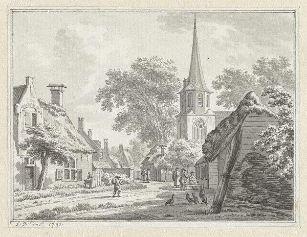Curator: Ah, a glimpse into the past. This is "Markt in het dorp Valkenburg" by Hermanus Petrus Schouten, dating roughly from 1757 to 1822, housed here at the Rijksmuseum. It’s rendered in ink on paper, a lively depiction of a market day. Editor: My first thought is… it's bustling, isn't it? Even with the limited palette, there's such a sense of activity. You can almost hear the vendors and the chatter of the crowd. I’m interested in how Schouten used very economical means. Curator: Precisely. The piece’s success relies so heavily on the skilled manipulation of ink to create depth and atmosphere. Look at the paper itself – a fairly commonplace material elevated through technique. How does the drawing's inherent materiality intersect with its function as a representation of village life? The materials speak to me of accessibility. Editor: From a historical perspective, this image offers insights into the socio-economic fabric of the time. Markets were not just places of exchange, but vital hubs for social interaction. Schouten's representation highlights the role of the church in the village life as well. What statement is the artist making? How does he portray class and hierarchy? Curator: Certainly. But the image, with its attention to ordinary labor and social exchange, offers a challenge to the more formal academic art of the time. Schouten seems intent on portraying the everyday labor inherent to trade. Consider too that ink drawings were often studies for larger works—raising the question: is the value in the finished object, or in the act of preparation? Editor: That tension is very engaging, especially regarding who the artist made this for. Was this drawing destined for a collector's portfolio, or was it part of a larger series intended for public consumption? Either possibility would influence the value, production, and ultimately reception of the piece. And Valkenburg itself; what was its standing in Dutch society at this time? All of that informs our appreciation. Curator: Indeed, the socio-economic forces play directly into artistic choices, consciously or not. A focus on the tools and modes of creation—the paper, the ink, the lines—unearths often overlooked but crucial aspects of our interaction with this art. Editor: Seeing this interplay is essential for unlocking how the visual arts impacted and were, in turn, influenced by the public imagination in eighteenth-century Netherlands. This image allows a modern audience to reconsider the concept of progress as it existed during the Neoclassical age. Curator: Yes, that intersection really encapsulates so much about the artistic landscape of the time. It is like we ourselves get to participate in that marketplace exchange when encountering a work such as this! Editor: Agreed, and seeing it that way makes the past feel all the more connected to our present.