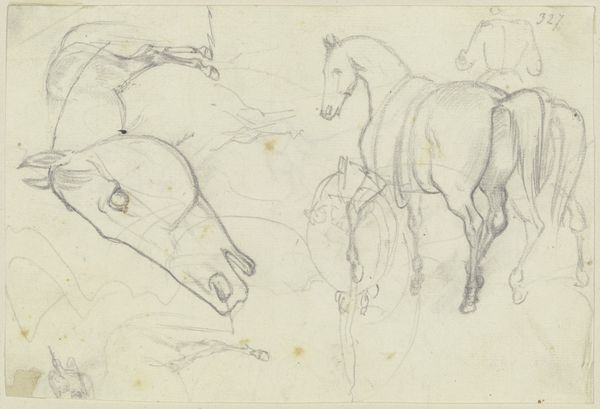 Editor: Here we have Leo Gestel’s “Galopperende paarden,” dating from 1891 to 1941, created with pencil on paper. There’s an energy in these horses, even though it's just a sketch. It's captivating. How do you interpret this work, especially concerning its materials? Curator: Consider the economic context of pencil and paper at the time. While seemingly simple, their accessibility played a key role in democratizing artmaking. Gestel, through the act of drawing, engages with the industrialized production of these materials. The pencil itself—its graphite mined, processed, encased in wood—represents a specific type of labor. What does the medium itself tell us? Editor: That the choice of materials isn’t neutral… almost subversive. But why horses? Curator: Think about the social role of horses. In this era, they are not only symbols of wealth and power but also essential for transportation, agriculture, even warfare. Gestel might be commenting on the relationship between nature, labor, and the accelerating pace of modern life as it becomes industrialized. Does this resonate for you? Editor: Yes, the sketch feels like an examination of raw energy both animal and mechanical... linked. Gestel also plays with perception in motion, perhaps suggesting a move toward mechanization. So the rough marks with an ordinary pencil… almost a deconstruction of what horse-power meant. Curator: Exactly. He questions established conventions by portraying a classical theme with readily available, "lowly" materials. His method and medium unite fine art and everyday realities into a singular, compelling composition. Editor: This shifted my perception of Gestel’s choice of medium—it’s so much more than “just a sketch.” Thank you for the insights! Curator: A new consideration on labor changed my perspective, too.