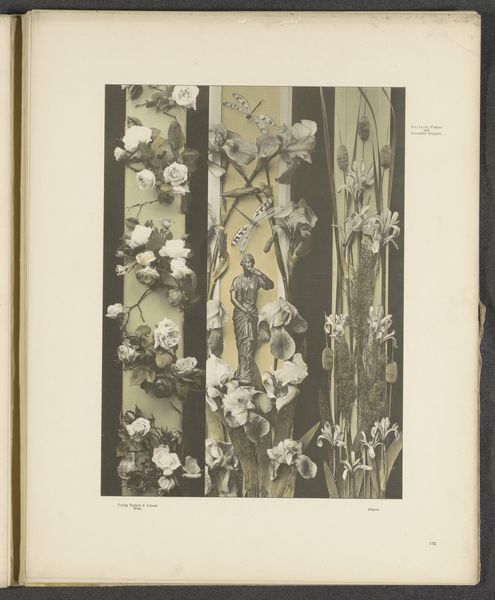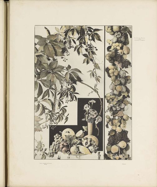 Curator: Look at this elaborate print! "Hangwerk van appels en een leeuwenkop en een festoen van pompoenen en een medaillon," an engraving from before 1897 by an anonymous artist. It features two vertical panels densely packed with… well, quite a lot. My first impression is one of almost overwhelming abundance and contrasting moods. Editor: Abundance is right. I’m immediately struck by the clear dichotomy between the light and dark panels—almost as though the artist wanted to showcase the possibilities afforded by the engraving process. One’s all luminosity, the other shadowed and deep. You almost want to touch it to compare the texture, right? I mean, what inks, what kind of plates, and how did they pull the impression? Curator: That light, ethereal side makes me think of summer, or a fruitful harvest. There’s such a lightness to the apples, the delicate ribbon. Yet above, there’s this snarling lion's head. It’s so curious! Like nature attempting a gothic grimace. What do you see? Editor: Exactly! I notice the paper is thick, it absorbed that dark pigment really well to make those contrasting heavy shadows. I'm so curious about the production and labor and printing techniques used back then. Someone put time and elbow grease into this; you can tell in the subtle gradations. This pre-industrial process connects to material and its manipulation through tools, skill, and labor. It stands as a monument to human ingenuity. Curator: It makes me think about the temporality too, all that life represented on a sheet, a record frozen, isn't it? And look! We even have tiny songbirds perching in it. Editor: It is! Like capturing and categorizing nature and the tools and technologies used to convey its likeness. And the juxtaposition in materials, with fruit beside a hard, fixed column in the darker panel, really emphasize materiality. There's definitely something about the contrast in the use of negative and positive spaces in these designs and production capabilities that draws me to analyze this engraving as something beyond ornamentation and status and, instead, an ode to labor! Curator: Thinking about our relationship to objects. Very intriguing! The symbolic weight feels immense: mortality, status, celebration... Perhaps, with the garland, this would make a funeral offering for someone? That touch of life and death intermingled! Editor: So next time we come across similar material, we will probably think beyond traditional values to consider production, consumption, the social construction of making! Curator: And I will remember the sheer exuberance of these fruits rendered on this engraving sheet, all their implications, all their emotional weight... Quite something!