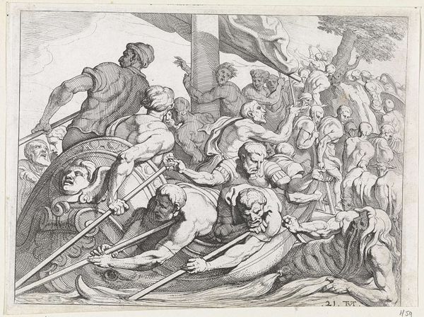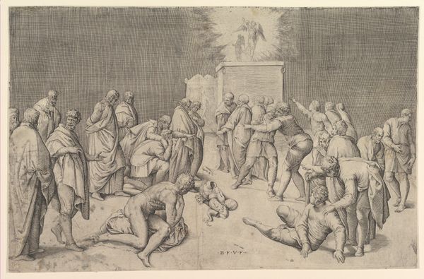 Editor: We're looking at Niccolò Giolfino's "The Arrest of Christ," made sometime between 1540 and 1550. It’s a pencil and colored pencil drawing on paper, and it just strikes me as… chaotic. A swirl of figures. What's your take on it? Curator: Chaotic is a great word. It absolutely captures the emotional turbulence Giolfino’s trying to convey. Forget static depictions of piety; here, we’re thrust into a frenzied mob, humanity at its most base. Can you feel that desperation in the press of bodies around Christ? Notice how Giolfino uses these tightly packed forms to generate a psychological tension – the breath before the storm. Editor: Yes, they are very tightly packed and the detail around Christ is quite amazing, considering what's happening. It gives you an unsettling feeling! How much of this drawing has to do with Giolfino? Curator: Aha! Excellent question. For me, it's the faces that truly give it away. Giolfino isn't just illustrating a historical event; he's wrestling with his own faith, his own understanding of betrayal. He projects inner turmoil outward onto each face – the snarling contempt, the blind fury, the confusion. Even Christ’s expression… what do *you* see in it? Is it resignation? Or something else? Editor: Maybe a bit of sadness and disappointment. Curator: Precisely! And isn't *that* what makes great art resonate? Giolfino offers no easy answers, only profound questions whispered across centuries. What do you make of the sketchy buildings in the background? Editor: Actually, I didn't even notice that at first glance! It’s interesting how something so central is hidden behind a chaotic foreground. Thank you! Curator: Hidden yet essential. Just like the layers of meaning in all truly compelling art, aren't they? The process of seeing… is always a surprise!