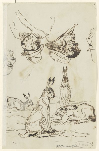 Editor: Here we have Johannes Tavenraat's "Hazen," likely created between 1880 and 1882. It’s an ink drawing on paper, showcasing three hares in motion. It’s got this energetic, almost frantic feel to it. What captures your attention in this piece? Curator: Oh, the delightful frenzy of it all! It reminds me of chasing after lost thoughts, doesn't it? Tavenraat captures that elusive quality of fleeting moments. Look at the simplicity of the lines – so economical, yet they convey such dynamism. Does it spark any connections to other artists, or perhaps personal experiences for you? Editor: It almost feels like a quick study, like something you'd find in a personal sketchbook. I am just wondering whether there is any symbolism related to depicting hares. Curator: Exactly! These were likely sketches, rapid notations of form and movement, and not necessarily meant for public display. The hare, often a symbol of fertility and timidity, could represent vulnerability, maybe a sense of being pursued. Or perhaps it’s just about the sheer joy of capturing their fleeting grace. It's all about reading between the lines – literally, in this case! Editor: I see what you mean! The quick, expressive lines do suggest capturing a fleeting moment, like a memory. It also allows seeing the dynamism through Tavenraat's perspective. Curator: Precisely. The personal and subjective interpretation makes it resonate across time, and space. Thank you, my friend, for the gift of new thoughts! Editor: Thank you, this opened my eyes. The idea that simplicity of lines may be capable of such meaning is quite enlightening.