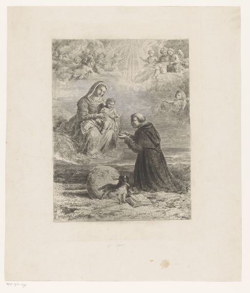 Editor: Here we have Adolphe Alexandre Dillens' 1861 engraving, “Vrouw met zwaard staat naast een lichaam waarvan het hoofd wordt vastgehouden door een duivelsfiguur,” which translates to "Woman with sword stands next to a body whose head is held by a devil figure." The scene is incredibly stark and disturbing. What strikes me is the power dynamic depicted and its allegorical feel; what’s your perspective? Curator: This work plunges us into a historical narrative brimming with complex layers of gender, power, and the grotesque. The woman, armed with a sword, confronts a scene of blatant barbarity executed by a demonic figure, so, let’s think about this for a moment. In what context might a female figure become the arbiter of justice against such overwhelming brutality? Editor: Perhaps it is speaking about the limited agency women have, that the demonic does what women have traditionally been disallowed to do? The way the woman is standing above but still cannot intervene feels deeply unsettling. Curator: Exactly. This piece can be viewed through the lens of feminist theory. We have a figure of female authority juxtaposed with horrific violence, suggesting the historical disempowerment of women even when confronted with blatant injustice. How does Romanticism play into it, considering its emphasis on emotion and individualism? Editor: It intensifies the emotional impact. The artist makes us confront not only the violence itself but also the moral quandary of the female figure’s ambiguous role. I think it gives us a view of both malevolence and restricted feminine capability in times of such gore. Curator: The work allows for such insight, doesn’t it? The historical context of Romanticism allows for reflection on gender roles of that era, allowing viewers to ask critical questions regarding the portrayal of power, gender, and societal complicity within historical narratives. Editor: Absolutely. I leave feeling unsettled yet better informed about the artist's, and maybe the time's, gendered societal interpretations.