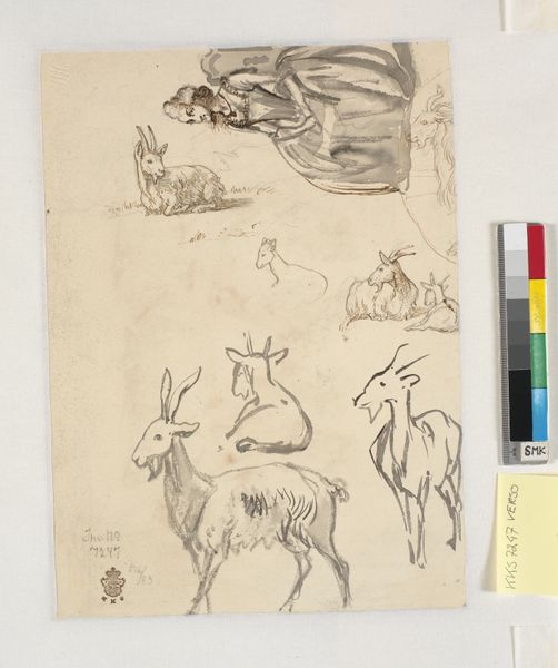 Curator: I'm struck by the raw quality of this preliminary illustration. It is called "Illustration til Den lille hvide kat samt skitser af gående mænd," or "Illustration for The Little White Cat with Sketches of Walking Men," completed sometime between 1923 and 1926 by Niels Skovgaard. It employs ink and pencil on paper, a study of motion, narrative and form, currently held here at the SMK. Editor: My first thought? Unease. The sketch on the right is lively enough with those figures hurrying along. But the more skeletal sketches on the left, so faint, seem like lost souls, don't you think? It reminds me of a grim shadow play. Curator: I see your point about the figures, but I find their presence more like a palimpsest, a visual memory layered with time and purpose. I suspect the ghostly images capture the artist at work, circling forms and gestures until the characters emerge that suit Skovgaard's interpretation of the "The Little White Cat." It shows his thought process. Editor: That's an interesting connection, the process laid bare... But why that subject? Fairytales were definitely weaponized in the early 20th century. With its dark shadows and angular forms, it could also signify the encroaching industrialism on a fragile world of folk narrative. This reminds me of contemporaneous socialist realism. Curator: It may also simply relate to how folklore allowed certain persistent visual metaphors and allegorical concepts to propagate among people. By drawing on those, his images access archetypes lodged in the viewer's own imagination. Editor: And in what ways do these archetypes empower or restrict meaning? For instance, why emphasize the brisk walking away? It might suggest anxiety surrounding the place of traditional narratives. Curator: Possibly, and perhaps that ambiguity is what's compelling about these studies. Skovgaard captures that liminal moment before characters and narratives harden into place. These figures, in their ephemerality, retain some of the original magic of storytelling, open for our reading. Editor: I'm still sitting with the unease of lost potential...But I admit the visual layering reflects how these figures negotiate between a collective narrative and personal freedom. Curator: Ultimately, Skovgaard delivers us more than mere illustration. The artist gives us something deeper to ponder as we find echoes of our own stories embedded within these haunting frames.