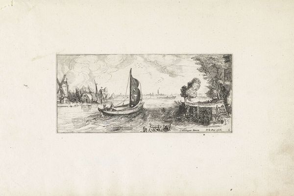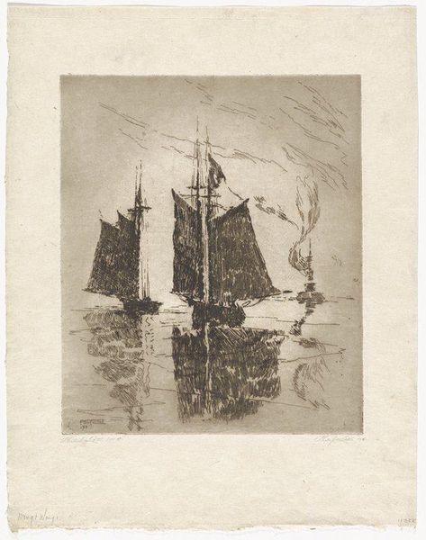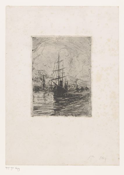 Editor: This etching, "Riviergezicht met stoomschip," or "River View with Steamship" created by Maurice Hagemans between 1862 and 1910, presents a hazy harbor scene. I find the composition quite somber. What catches your eye? Curator: Ah, yes, somber, but not without a strange kind of vibrancy. It's more of a feeling, you know? Look how Hagemans uses those delicate lines, they dance and shimmer. It almost feels as if you could smell the dampness of the air or hear the creak of the ship against the dock. Doesn’t it remind you of those fleeting moments when reality seems just a breath away from dissolving into a dream? Editor: It does have a dreamlike quality! The steamship almost appears to be fading into the mist. Do you think that's intentional? Curator: I’m certain of it. I believe Hagemans was very much aware of the fleeting nature of modern life. Ships replaced by faster trains replaced by even faster cars and airplanes. What do you make of the hazy skyline barely discernible in the background? It's not simply a literal depiction of a harbor; rather, it whispers of transformation and memory. Nostalgia. Editor: So, it’s not just about a cityscape, but also a commentary on a changing world? Curator: Precisely! The visible, barely-visible details are more than just features in a scene. Hagemans isn't showing you the world; it invites you to conjure your own reality. Did Hagemans capture the mood? Or, perhaps, is the viewer bringing their own mood? This is impressionism; all is but feeling. Editor: I hadn't thought of it that way before, seeing it as a feeling rather than just an image. Curator: Sometimes, the most potent stories are those left half-told, urging us to participate in the narrative. You may feel it now as did the master! Editor: This has definitely broadened my view of impressionist prints; they seem a lot less rigid and way more expressive now.