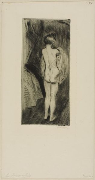 Curator: Here we have Charles Haslewood Shannon’s print, "Salt Water," held in the Harvard Art Museums collection. Editor: It's surprisingly intimate, despite the classical nude figures. The sketchy lines create a sense of fleeting movement. Curator: Shannon was deeply involved in the Aesthetic movement, and these prints, popular among the literati, often depicted idealized figures in natural settings. Editor: Idealized, yes, but also grounded. Look at the visible marks of the pencil, the textured paper. It reminds you that art is made, not just conceived. Curator: Absolutely. These prints allowed for wider circulation of aesthetic ideals beyond the elite painting market. This facilitated broader consumption of beauty, democratizing art. Editor: And what about the labor? How many hours did Shannon pour into etching the plate? The handmade quality has its own intrinsic value. Curator: That's a perspective often overlooked, isn't it? It's fascinating to consider how this piece navigated both aesthetic trends and the means of its creation and distribution. Editor: Indeed, a reminder that even idyllic scenes are products of material reality and labor.