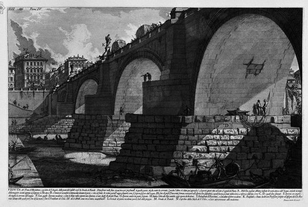 Editor: This is Giovanni Battista Piranesi's "The Roman Antiquities, t. 2, Plate XVI. Inscriptions and fragments of the burial chambers of the Family Arrunzia," created in 1756. It's a drawing, etching and print. The sheer scale and the sense of decay are overwhelming! What can you tell me about this work? Curator: Piranesi presents us not just with Roman ruins, but with a critical lens on history and power. It's not simply about celebrating antiquity. What do you observe about the figures included? Editor: They seem out of place, almost like tourists in a tomb. Curator: Exactly! This juxtaposition is key. Piranesi uses these small figures to emphasize the grandeur of the Roman architecture but also, crucially, to comment on the contemporary obsession with the past. Who gets to access and interpret history, and for what purposes? Notice how the etching technique captures both the monumental scale and the crumbling details. Is there something that stands out? Editor: How the names are carved on the walls makes it feel as though they belong to people who had some kind of power or influence. Curator: That’s a critical observation. This wasn't a neutral act of documentation; it was a conscious decision to highlight particular voices, immortalized within these structures. Moreover, the romantic ruins speak about how societal forces impacted people back then as opposed to today's struggles. Considering that intersectionality is crucial to examine beyond their historical contexts. What does the composition tell us about who controlled the narrative? Editor: That's insightful. The placement of those figures and the decaying architecture really pushes us to consider the power dynamics embedded in how we view history. Thanks for sharing your perspective. Curator: And thank you for drawing out such thoughtful observations. Piranesi urges us to constantly question the present through the lens of the past and to examine whose stories are amplified and whose are silenced within these representations.