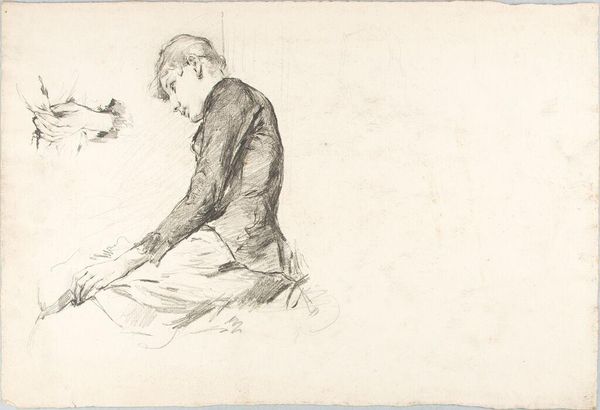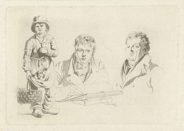 Editor: So, this is Jacob Ernst Marcus' "Portret van François Joseph Pfeiffer en een tekenende jongen," created around 1815 using pencil. There's a really interesting dynamic between the two figures. It almost feels like a commentary on observation and representation. What do you make of it? Curator: The fascinating element lies in the public role of portraiture in the early 19th century. Portraits weren't simply likenesses, but powerful statements about social status and even budding Romantic ideals about individuality. This drawing, presented in the neutral public space of the Rijksmuseum, speaks volumes about Pfeiffers’ perceived importance. But consider, what does it mean that he is depicted alongside a "drawing boy," implicitly referencing creative inspiration? Editor: I guess it suggests Pfeiffer is either a patron of the arts, or associated with intellectual pursuits? The boy seems so intent, focused in a way the older man isn't. Curator: Precisely. This work reflects a shift where art was moving from being seen as pure skill, to something aligned with inspiration and expression. Think about how academies were increasingly concerned with cultivating “genius.” By juxtaposing Pfeifer and the boy, the artist implies the adult possesses that very same spark. The image's accessibility would be heightened through engravings and reproductions, spreading Pfeiffers image even more widely. Editor: It's clever how a seemingly simple drawing can tell us so much about how art and its role in society were perceived at the time. Thanks! Curator: My pleasure! This has helped solidify some of my evolving thoughts, about Romantic portraiture!