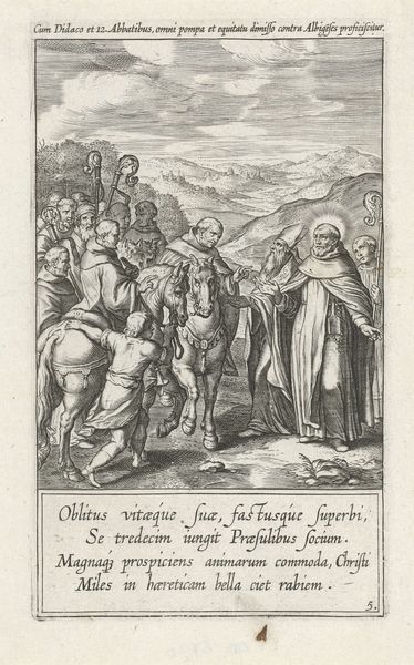 Theodoor Galle created this engraving, "Heilige Dominicus weigert de bisschopszetel van Conserano," sometime between the late 16th and early 17th centuries. Galle was part of a prolific family of artists and printmakers in Antwerp, a city then at the heart of the Counter-Reformation. The artwork depicts Saint Dominic refusing the seat of bishop. It asks us to consider power and piety in the early modern world. Dominic, identifiable by his halo, stands on a step, gesturing outwards, seemingly rejecting the mitre, or the hat of the bishop, being offered to him. Galle's composition subtly contrasts the saint's humble demeanor with the opulence associated with ecclesiastical power. It subtly critiques the hierarchical structures of the Church, implicitly questioning the moral authority of those who seek high office. Yet, it also portrays an individual’s personal choice to forego power. What does it mean to renounce worldly authority in pursuit of spiritual purity? What are the costs and rewards, both personal and societal, of such a decision?
