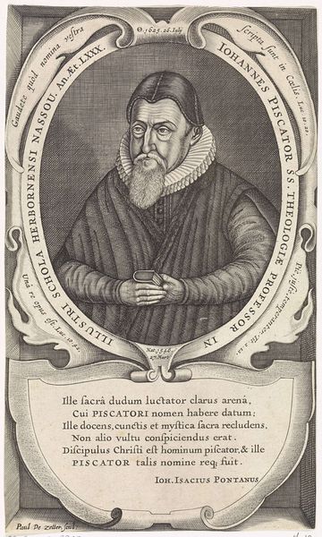 Curator: Here we have a portrait of Sigismund Feyerabend by Johann Sadeler I. Feyerabend was an important Frankfurt publisher, and this engraving captures him in his late fifties. Editor: The textures are remarkable! Look at the fur collar, the ruffles, and the etched lines that give his face such character. The stark contrasts create a really compelling sense of depth. Curator: Indeed. Note how Sadeler's detailed rendering promotes Feyerabend's status and the humanist values of his profession, as evidenced by the angel trumpeting his fame. The book in his hand is no accident. Editor: It's a powerful statement using only line and form. Curator: It certainly invites us to consider the role of the printed word in shaping early modern society. Editor: It's fascinating how the artist manipulates light and shadow to guide our eye to the publisher's expression, conveying both authority and perhaps a hint of weariness. Curator: A poignant perspective given the period's sociopolitical conflicts. Editor: A perfect encapsulation of character through pure visual language.
