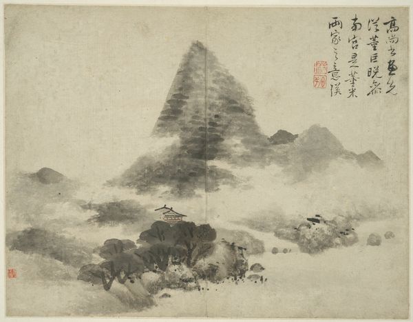 Mi Youren created this landscape, Cloudy Mountains, in the twelfth century using ink on paper. The image is dominated by soft, graded washes of ink, which create the impression of mountains shrouded in mist, evoking a feeling of serene distance. The composition is divided into distinct horizontal layers, guiding the viewer's eye from the foreground to the distant peaks. Note how Mi Youren uses the ink washes not just to depict form but also to suggest atmospheric perspective. Areas of darker ink define the contours of the mountains and trees, while lighter washes create a sense of depth and recession. The seals and inscriptions, an integral part of the work, act as visual counterpoints to the landscape, creating a dynamic interplay between text and image. The arrangement of forms invites a kind of visual wandering, a key aspect of how landscape painting functions within Chinese aesthetic and philosophical traditions. Ultimately, Mi Youren's masterful use of ink and his sophisticated understanding of composition invite us to contemplate the relationship between the self, the natural world, and representation.