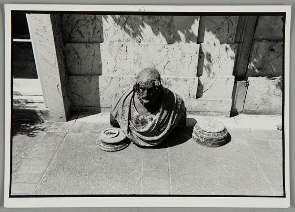 Editor: This photograph by Martin Schweig titled "Potter, India" captures a man among his wares. The stacks of pottery, still bearing the marks of the maker, are quite compelling. What stands out to you about it? Curator: The image powerfully connects labor, materiality, and the economic realities of its creation. The potter’s posture, the arrangement of the pots – they all speak to the process of production and consumption within a specific social context. Do you see how the framing emphasizes the potter’s physical connection to his products? Editor: Yes, his work is literally all around him, and the framing really highlights that. I never would have thought about the consumption aspect. Thanks for that. Curator: Considering the means of production highlights the human element often obscured in discussions of art.