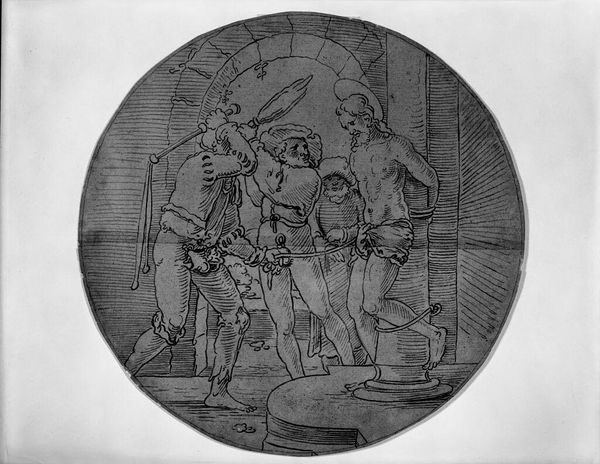 Editor: This stained-glass roundel, "The Prodigal Son Feasting," was created by Pieter Coecke van Aelst sometime between 1535 and 1545. There's something both festive and cautionary in the scene, a morality tale almost. What sort of societal narrative was van Aelst trying to create here? Curator: That’s a very astute observation. Stained glass at this time served not just a decorative purpose, but also a didactic one. The story of the Prodigal Son, seen through the lens of the Italian Renaissance and imported to the Netherlands, offers a potent allegory about wealth, morality, and social order. Notice the architectural setting—what does it suggest about the patron’s status and understanding of Italianate grandeur? Editor: It looks pretty fancy - there is marble everywhere! So the commissioner may have been very wealthy, attempting to show how in touch they were with international artistic tastes by including the trendy arches and columns? Curator: Precisely. The roundel acts as a signifier of status. More critically, the inclusion of the prodigal son theme points towards anxieties about excessive spending, and perhaps the nouveau riche flaunting their gains. It's interesting how art is both mirroring societal development and pushing the boundaries of how we understand wealth. Does the way that this theme has endured say something about unchanging social dynamics, you think? Editor: It really makes me consider if, perhaps, similar stories from our own time might resonate in a way that mirrors that of the 16th century viewer? What happens when this sort of window finds its way into a modern museum, though? Has its job description shifted? Curator: Now it invites us to ponder historical ideas about societal problems and values and their development into modernity. Its primary goalposts now sit squarely within the realms of educational insight and, importantly, the generation of more questions surrounding both history, and current cultural values. Editor: I see, a piece that now reflects upon itself, and society’s own view of historical frameworks. Thank you so much!